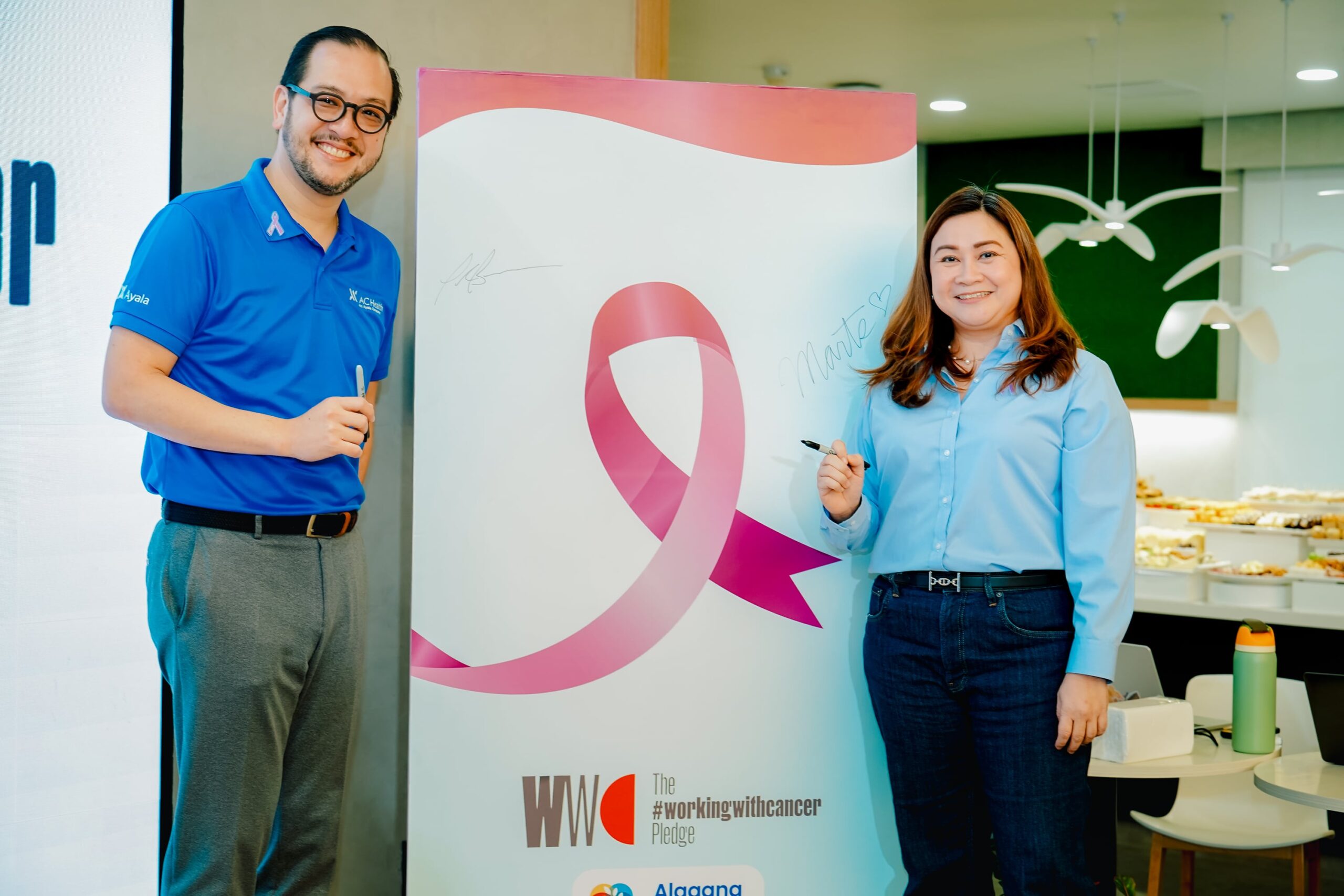 AC Health president and CEO Paolo Borromeo, and Mynt president and CEO Martha Sazon, demonstrate their commitment to the Working with Cancer Pledge during the launch of new comprehensive cancer care benefit packages for GCash employees