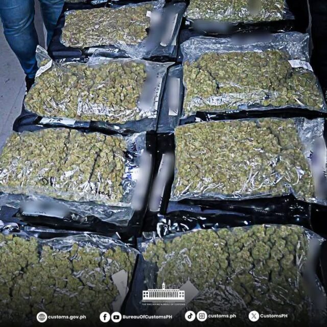 Earlier, BOC with the Clark Inter-Agency Task Force Against Illegal Drugs seized 4.11 kilograms of high-grade marijuana with an estimated value of P6.16 million. The shipment, declared as “polyester rug runner,” came from California, USA, and was intended for San Mateo, Rizal.