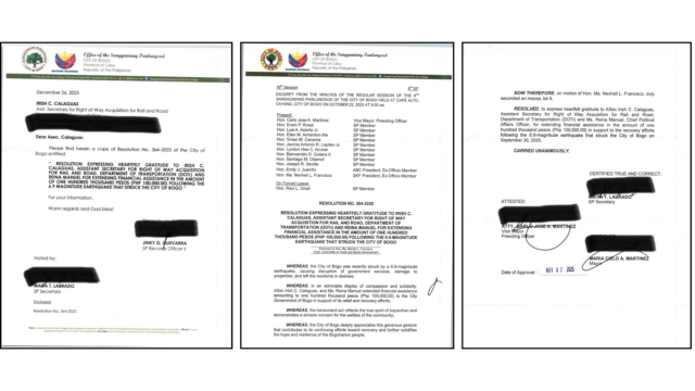 FIRST DISTRICT, Pampanga – The Sangguniang Panlungsod of Bogo City, Cebu, through Resolution No. 364-2025, expressed their gratitude to Department of Transportation (DOTr) Assistance Secretary for Right-of-Way and Site Acquisition IC Calaguas and Chief Political Affairs Officer Reina Manuel for their P100,000 personal donation for the victims of the 6.9 magnitude earthquake that struck Bogo City on September 30, 2025.