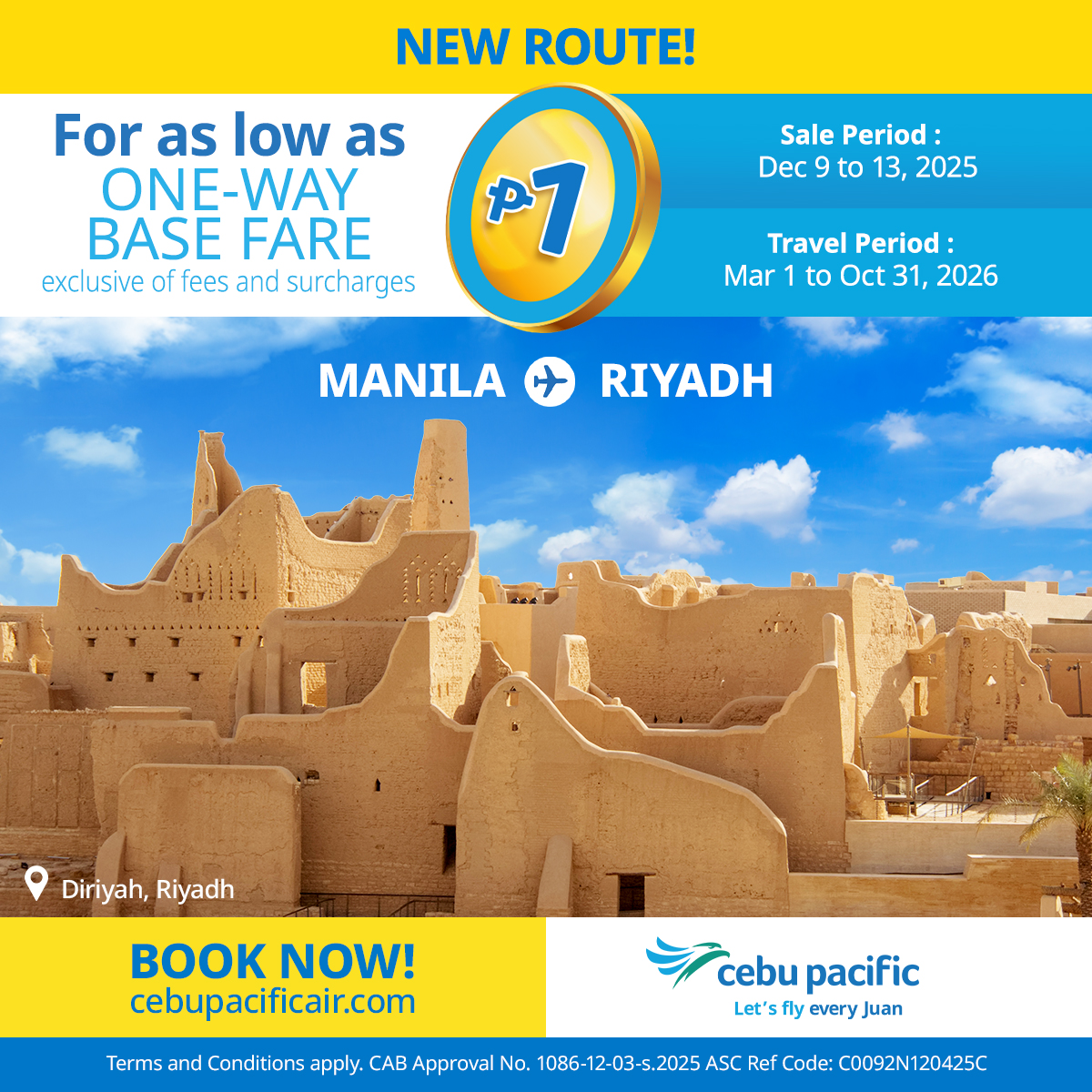 To make this route launch even more meaningful, CEB is rolling out a special seat sale from December 9 to 13 where passengers can book their flights between Manila and Riyadh for as low as PHP 1 one-way base fare, exclusive of surcharges and other fees. The travel period is from March 1 to October 28, 2026, ideal for OFWs planning vacations or homecoming celebrations next year.
