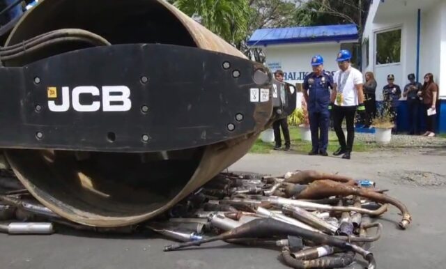 Gov. Daniel Fernando and Bulacan police director Col. Angel Garcillano led the destruction of the noise-causing mufflers that were run over with a compactor truck to render them useless.