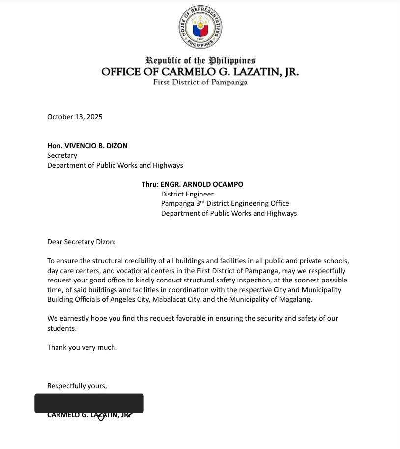 “Maraming report mula sa mga magulang na nag-aalala para sa kanilang mga anak sa eskwela dahil sa sunod-sunod na lindol sa mga nakalipas na araw,” Lazatin said. “Kaya hiniling po natin sa DPWH, through Secretary Vince Dizon at Engr. Arnold Ocampo ng Pampanga 3rd District Engineering Office, na magsagawa ng inspeksyon ng structural safety ng mga gusali at pasilidad ng mga paaralan para siguraduhin ang kaligtasan ng mga estudyante at maibsan ang pag-aalala ng kanilang mga magulang.”