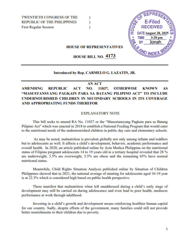ANGELES CITY — Pampanga 1st District Rep. Carmelo “Pogi” Lazatin, Jr. has filed House Bill No. 4173 seeking to include undernourished public secondary school students in the coverage of the Department of Education’s school-based feeding programs under RA 11037 (Masustansiyang Pagkain Para Sa Batang Pilipino Act).