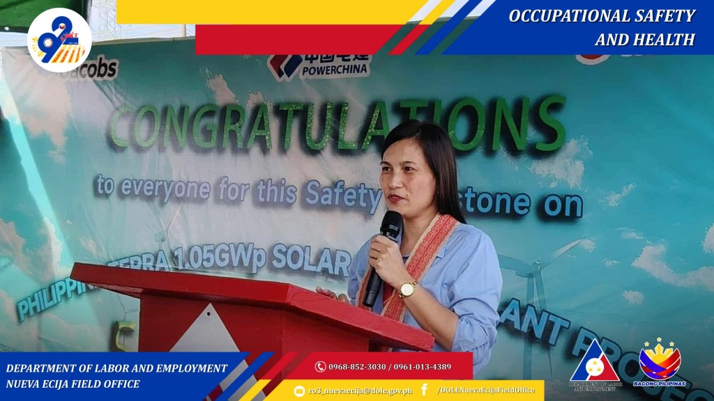 Department of Labor and Employment Nueva Ecija Officer-in-Charge Ethell Galvan emphasizes the importance of sustaining occupational safety and health compliance during Power China Construction Company’s celebration of five million safe man-hours without lost time accident for its 1.05-gigawatt-peak solar power plant project in Barangay Macabaklay, Gapan City, Nueva Ecija. (DOLE Nueva Ecija)