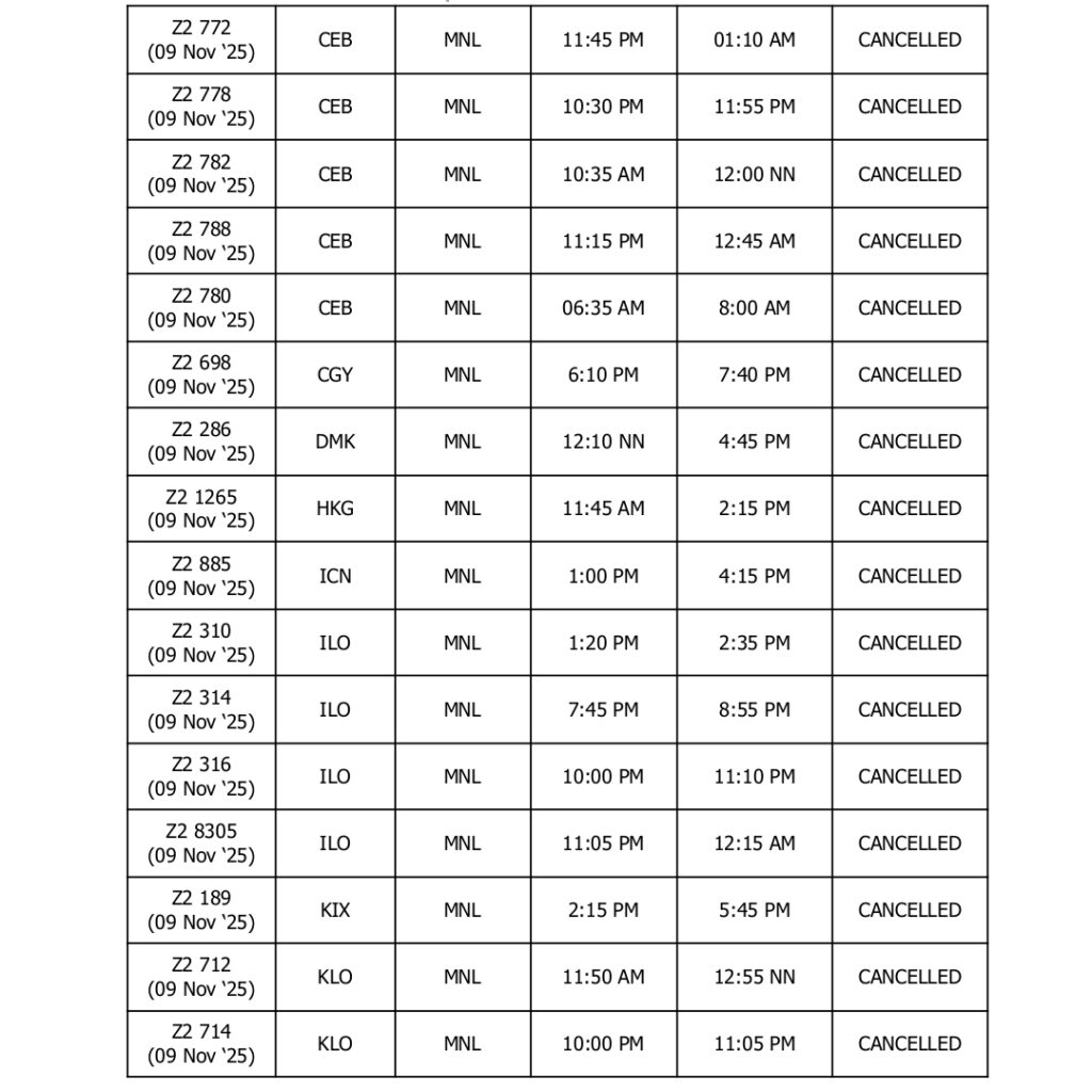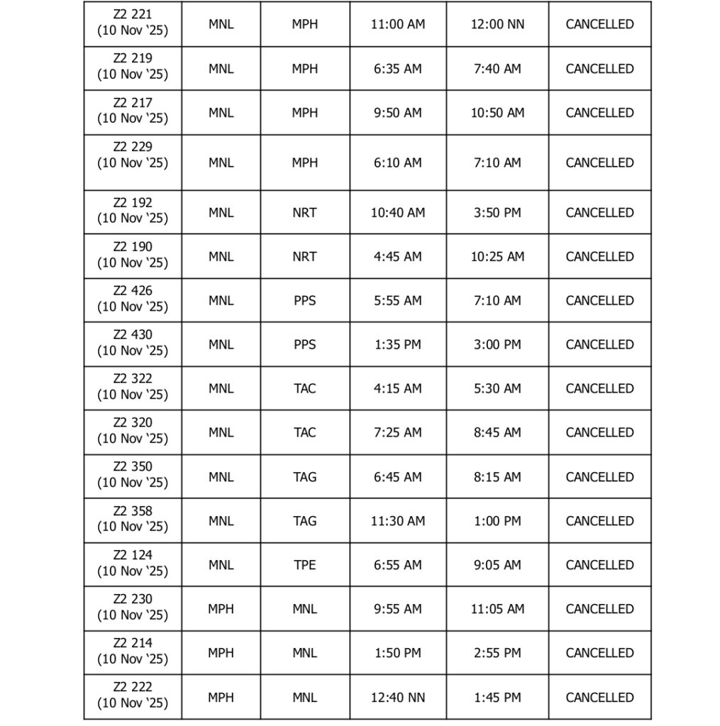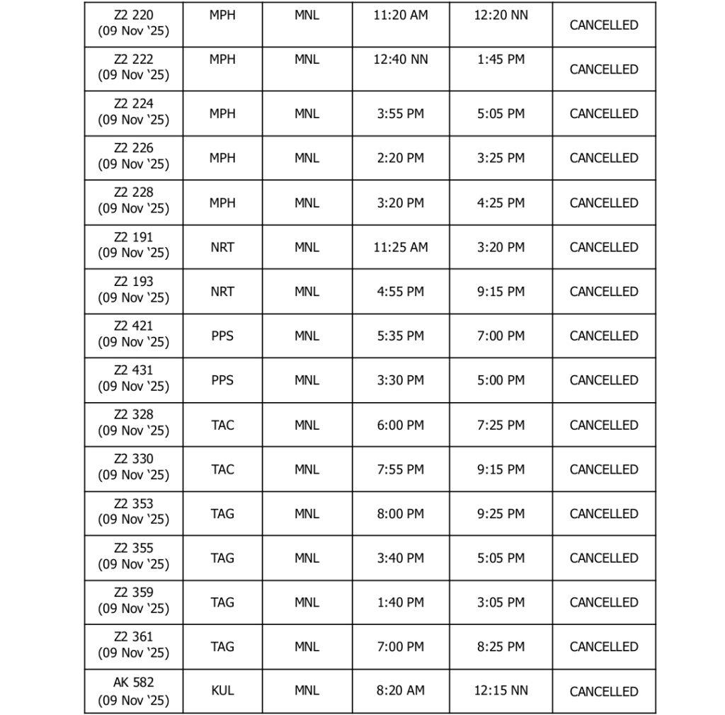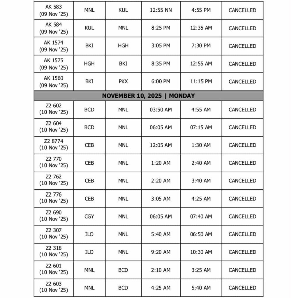 UPDATED AS OF 2200H (10:00PM), 08 November 2025, Manila, Philippines – In light of the forecasted severe weather conditions brought by Super Typhoon Uwan (international name: ‘Fung-Wong’), AirAsia Philippines (Z2) and AirAsia Malaysia (AK) have proactively cancelled the following flights going to and from Manila on 09 and 10 November 2025: