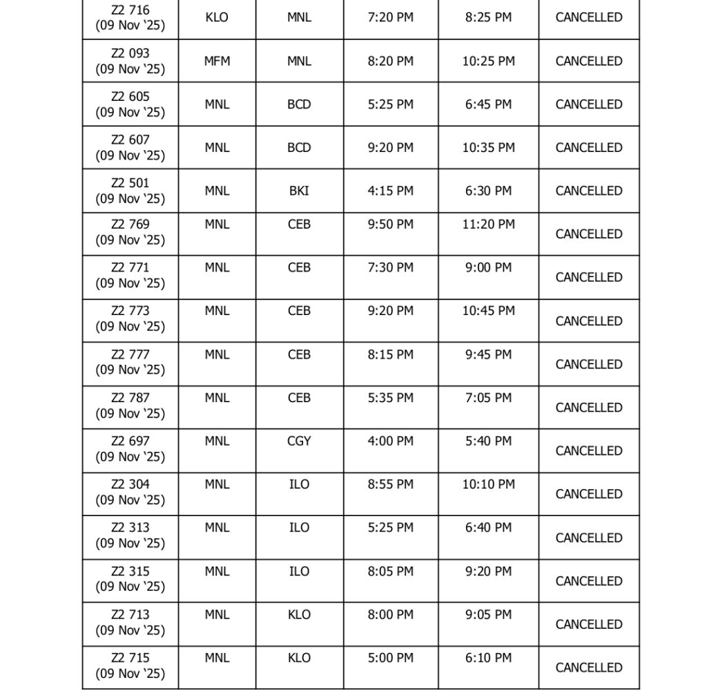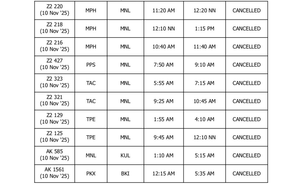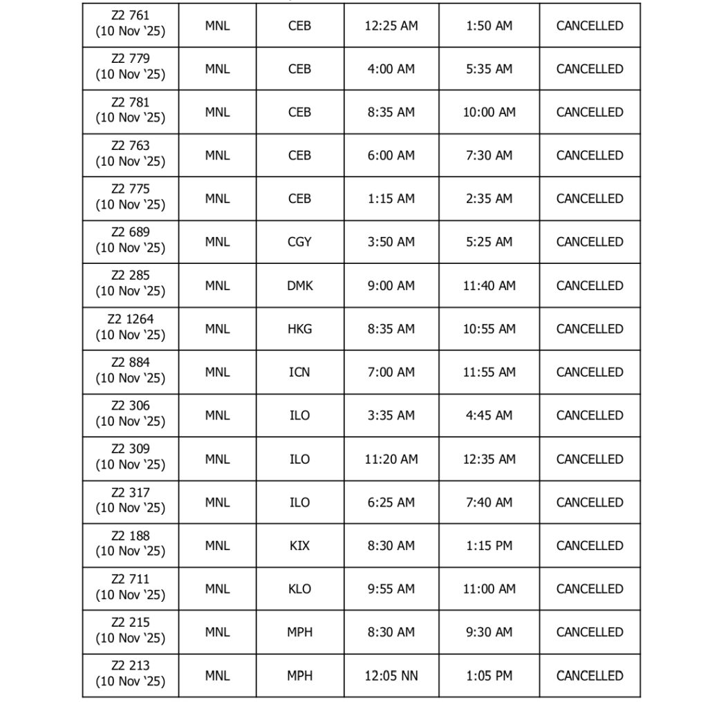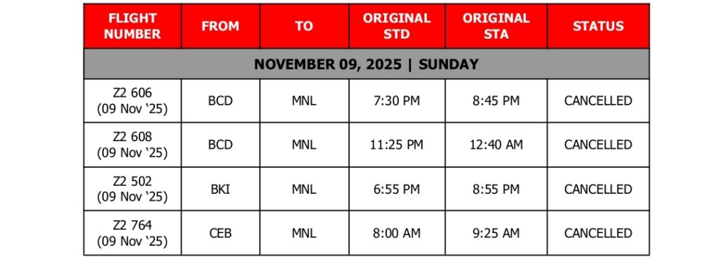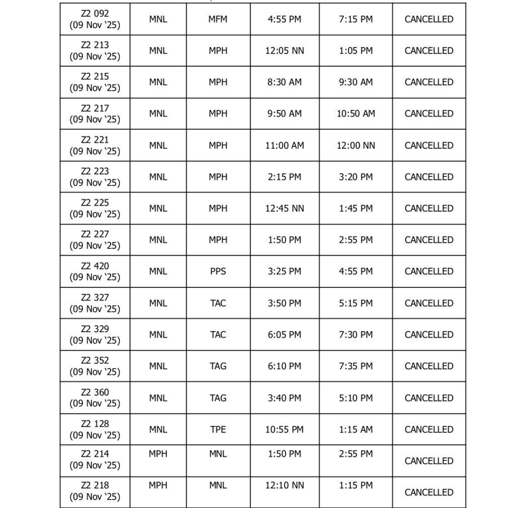UPDATED AS OF 2200H (10:00PM), 08 November 2025, Manila, Philippines – In light of the forecasted severe weather conditions brought by Super Typhoon Uwan (international name: ‘Fung-Wong’), AirAsia Philippines (Z2) and AirAsia Malaysia (AK) have proactively cancelled the following flights going to and from Manila on 09 and 10 November 2025: