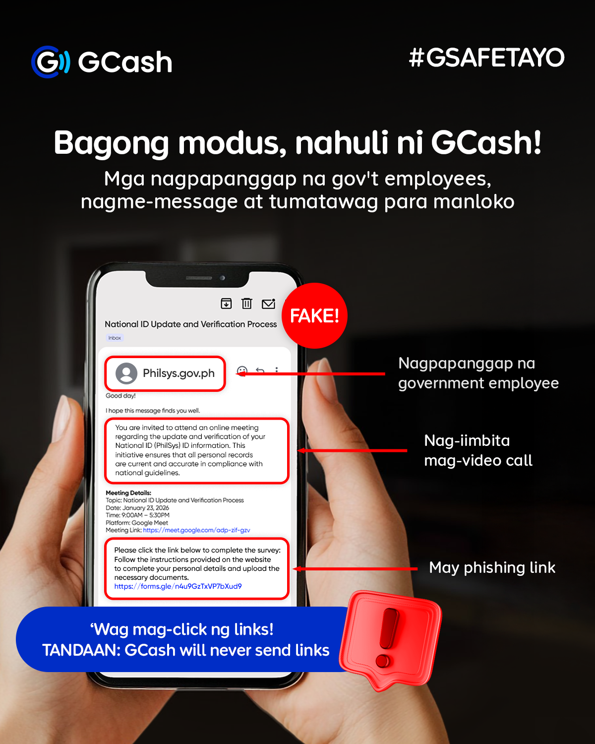 GCash is warning the public against new scam tactics that involve fraudsters posing as representatives of legitimate organizations or government agencies. Scammers are employing increasingly sophisticated tactics, including phone calls, emails, fake apps, and staged online video meetings, to pressure victims into revealing their account credentials, resulting in unauthorized access and financial loss.
