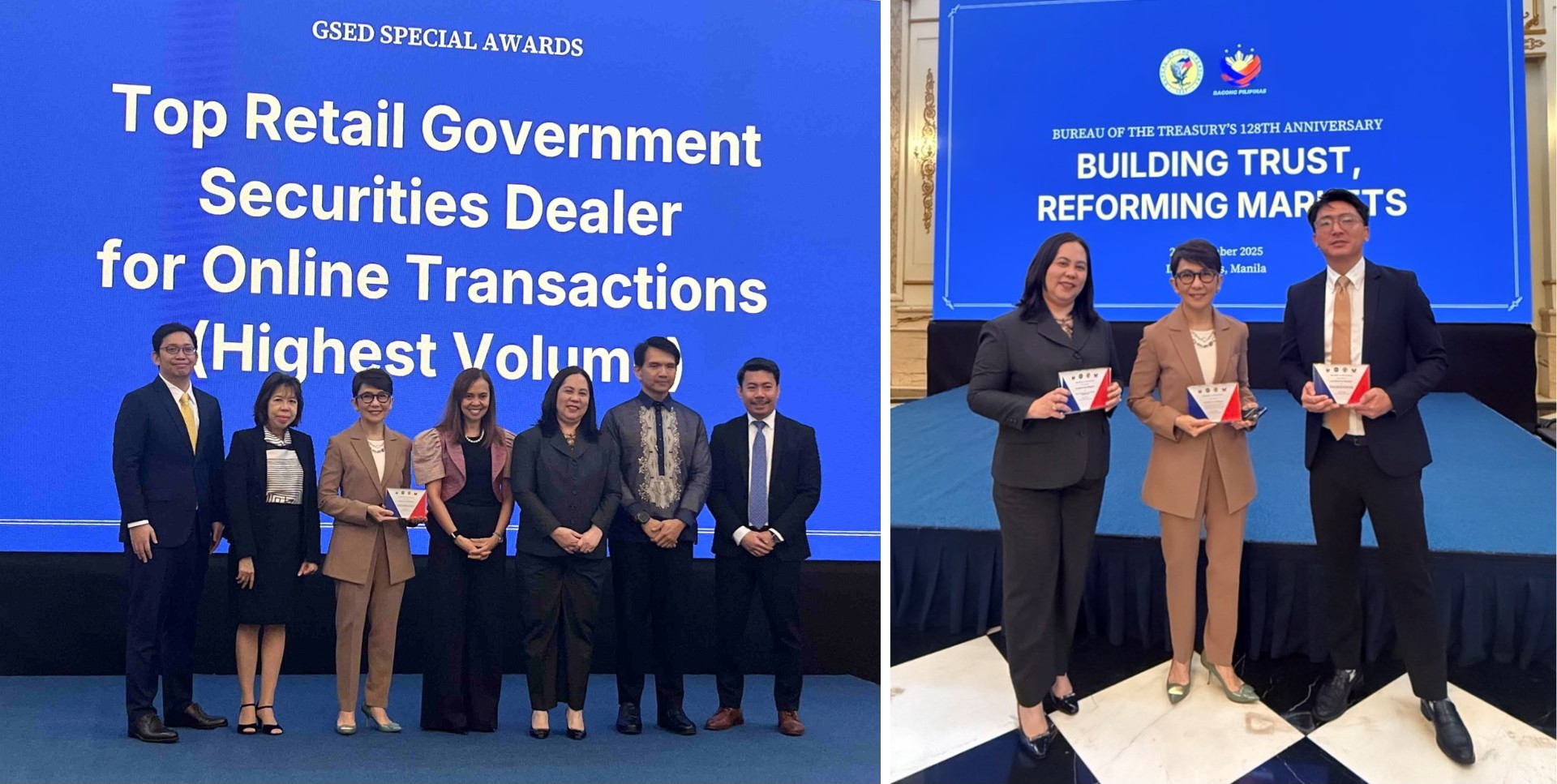 LANDBANK was recognized as one of the Top 10 Government Securities Eligible Dealers (GSEDs) for 2025, and received two special awards as Top Retail GSED for Online Transactions (Highest Volume) and GSED with the Highest Auction Share of Treasury Bonds during the 128th Anniversary Celebration of the Bureau of the Treasury (BTr) and GSED Awarding Ceremony 2025 held on 25 November 2025 in Intramuros, Manila.