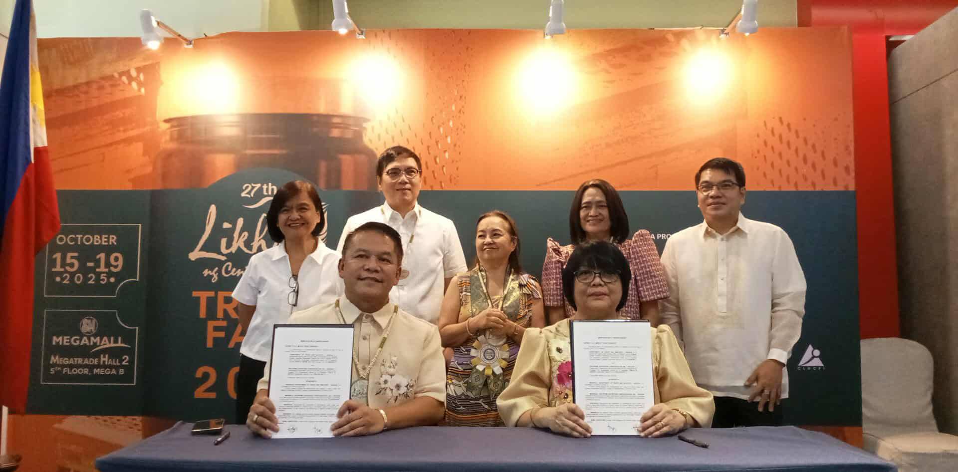 Former President and Pampanga Second District Representative Gloria Macapagal Arroyo witnesses the signing ceremony between the Department of Trade and Industry (DTI) and the Philippine Exporters Confederation Inc. (PhilExport) to launch the Learning and Mentoring Partnership for Aspiring Exporters at the 27th Likha ng Central Luzon Trade Fair in SM Megamall, Ortigas Center, Mandaluyong City. (Shane F. Velasco)