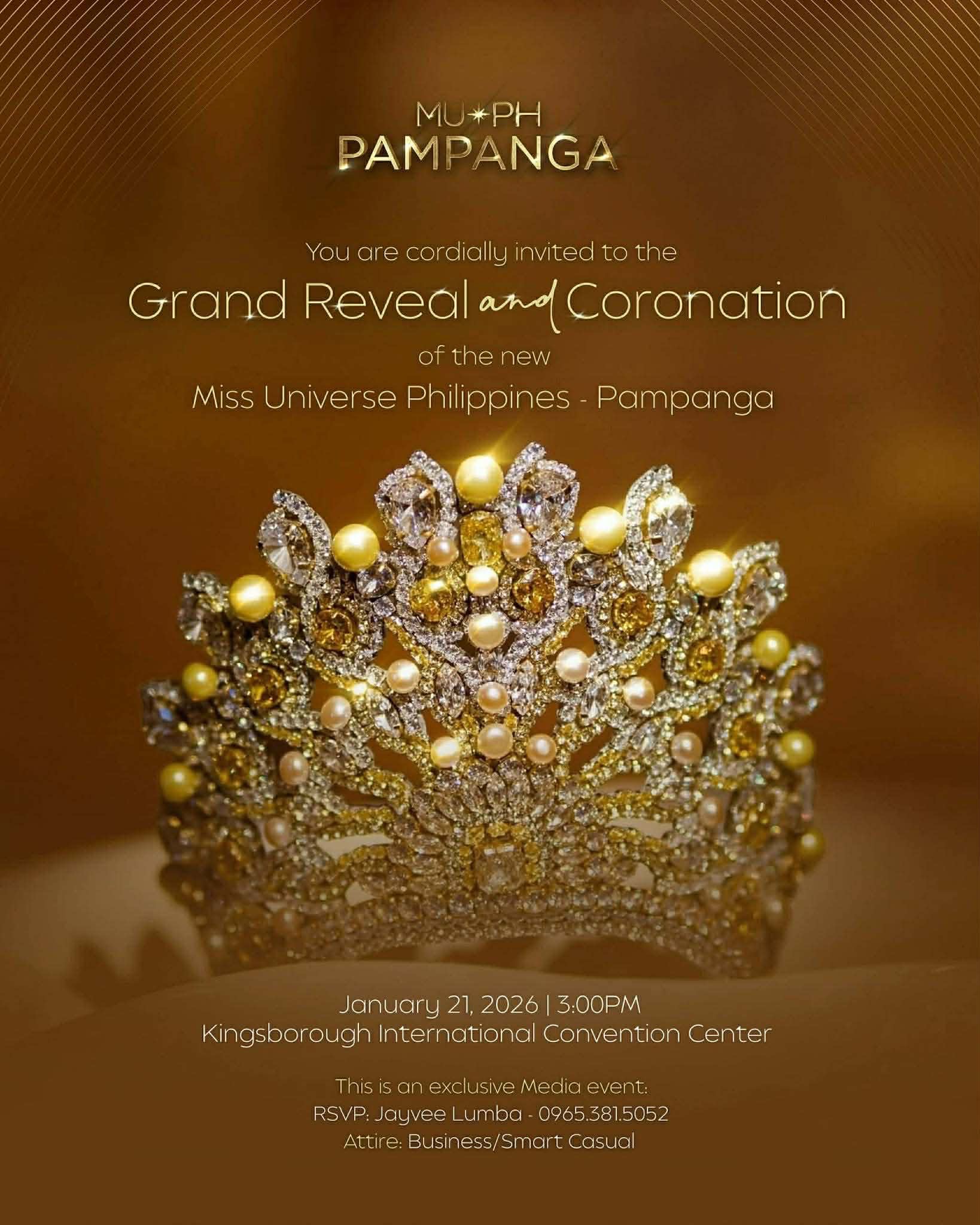CITY OF SAN FERNANDO — The Miss Universe Philippines Pampanga is set to reveal its appointed queen in a grand revelation and coronation ceremony on January 21, 2026, at 3:00 PM at the Kingsborough International Convention Center.