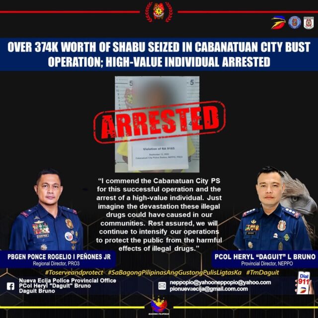 “I commend the Cabanatuan City PS for this successful operation and the arrest of a high-value individual. Just imagine the devastation these illegal drugs could have caused in our communities. Rest assured, we will continue to intensify our operations to protect the public from the harmful effects of illegal drugs,” pahayag ni Bruno.