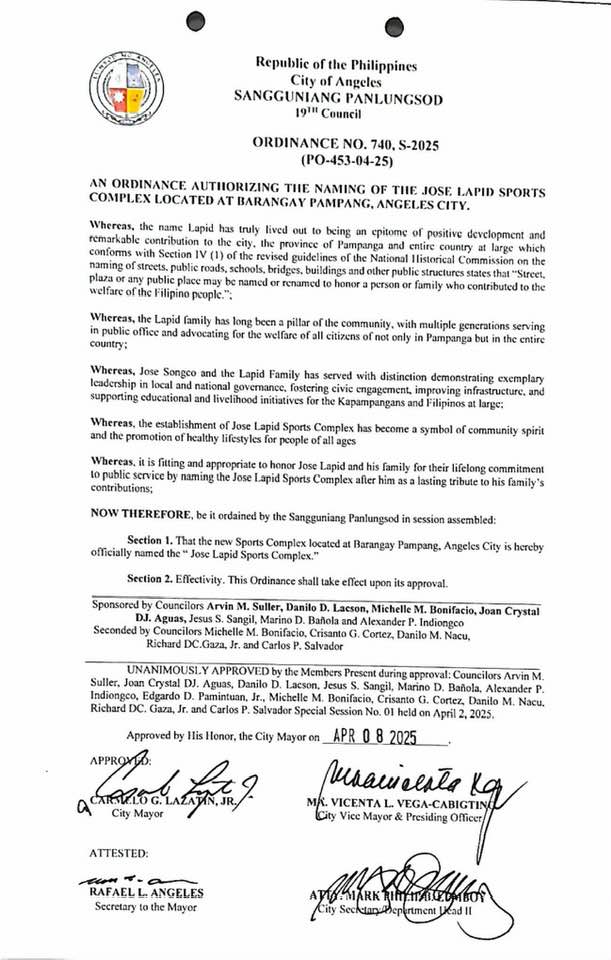 KAMI PO sa Advocate for Genuine Services (AGOS) ay pormal na naghain ng Petisyon at Liham-Protesta laban sa Ordinansa Blg. 740, S-2025, na nagpapangalan sa isang pampublikong pasilidad sa Barangay Pampang, Lungsod ng Angeles bilang Jose Lapid Sports Complex.