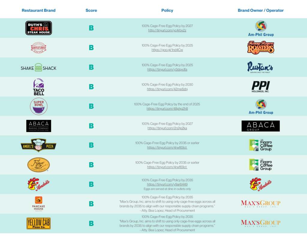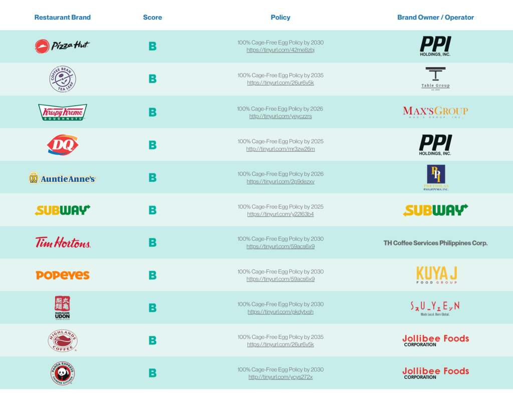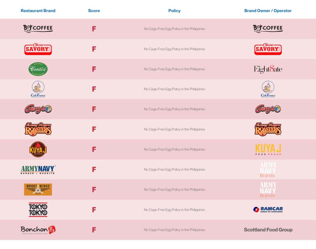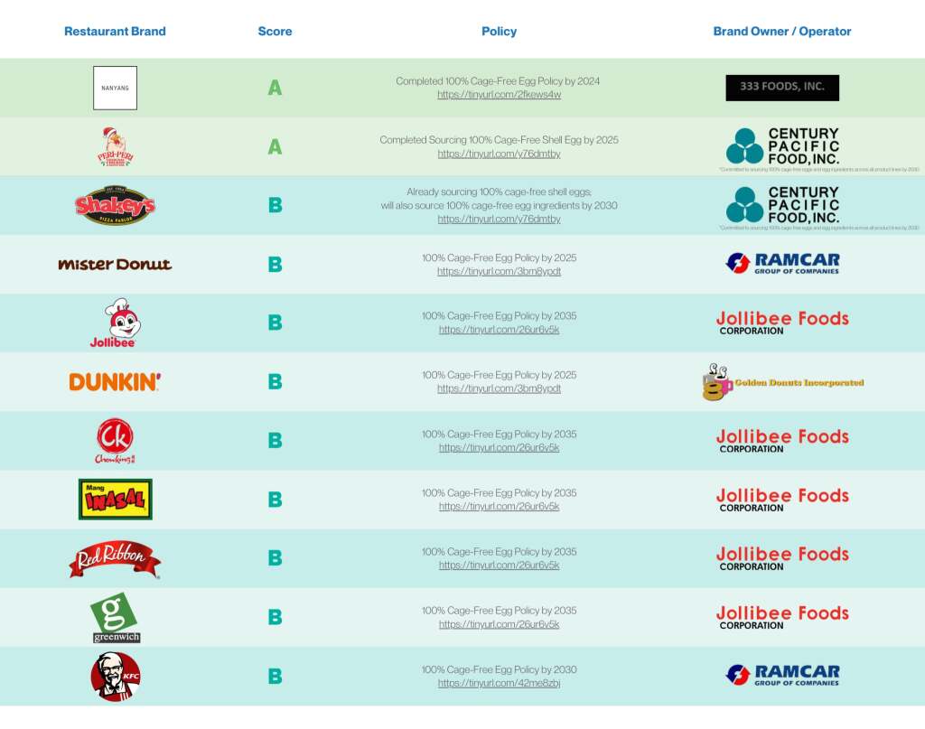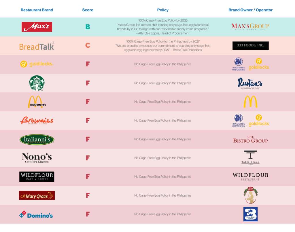 Only 20 of the leading chain restaurant brands in the country still serve caged eggs to their customers, with no timeline for shifting to cage-free. These include Goldilocks (which publicly pledged to set a cage-free egg policy by the end of 2025, but failed to do so), Army Navy, Wildflour, Nono’s, Italianni’s, McDonalds, and Starbucks.