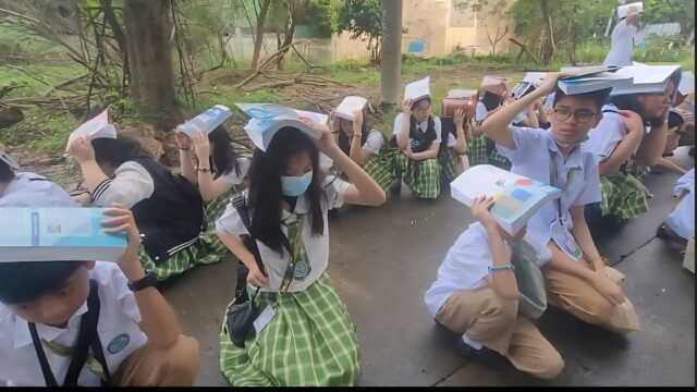 Upon the alarm signal that there was a simulated earthquake, the students together with the teachers performed duck, cover, and hold. Then they slowly moved out of the buildings and assembled atthe empty lot away from the buildings while still covering their heads with books.