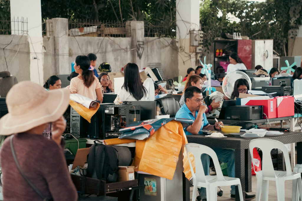 “We only got to secure our cameras today because the second floor of the municipal hall collapsed,” Fiel shared, his tone quiet but resolute. With their main office gone, hundreds of local government workers continued their duties inside a multipurpose hall turned operations center. There was no air-conditioning, no comfort, only commitment. Their exhaustion was visible, but so was their faith.